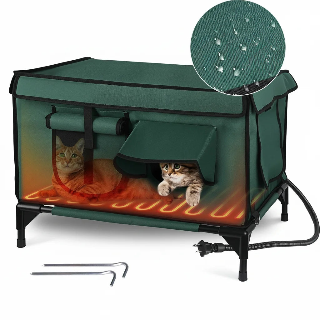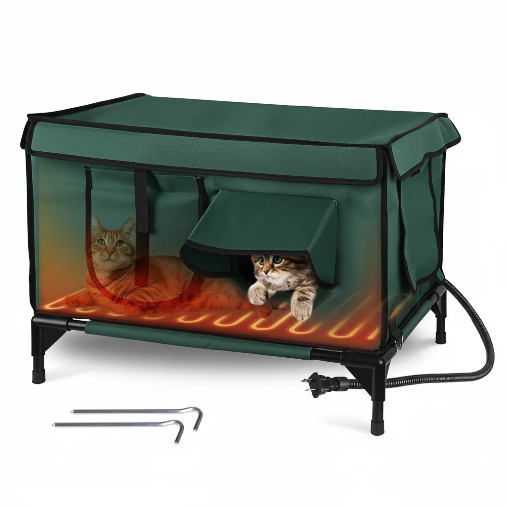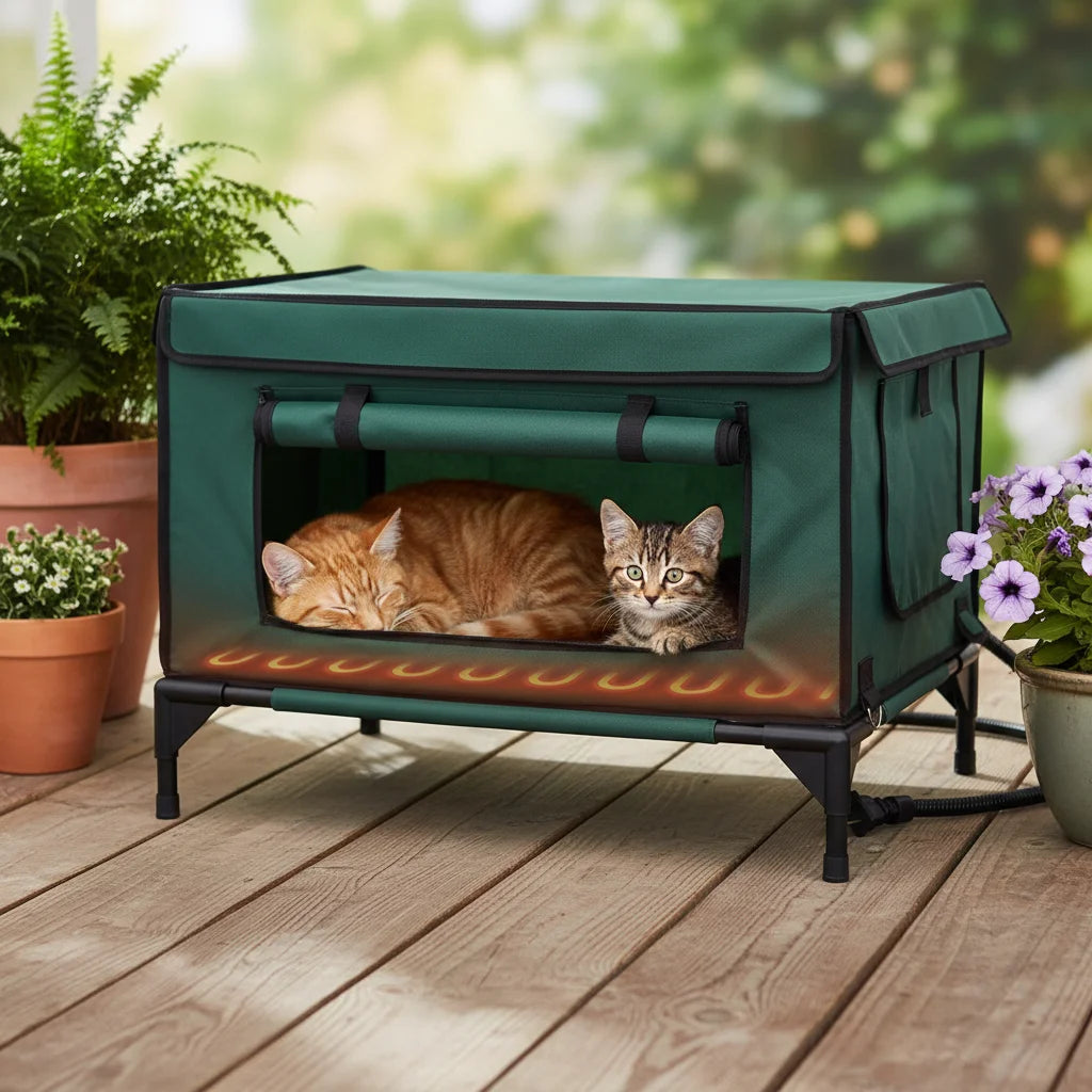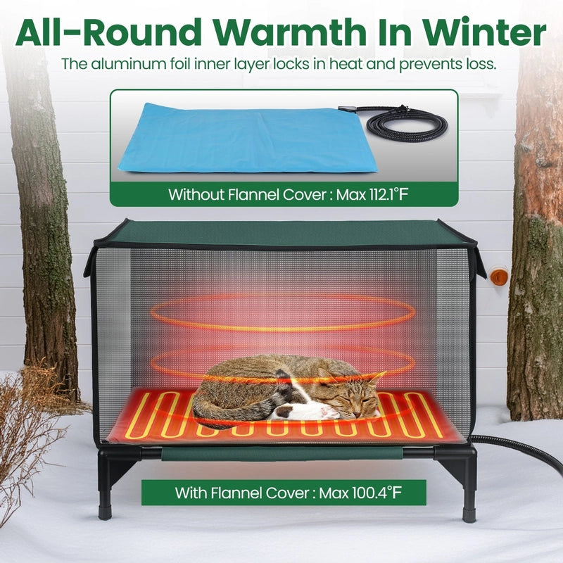 An anti-chew cord and elevated design mean your cat is safe from hazards and comfortably off the cold, wet ground. Peace of mind, guaranteed.