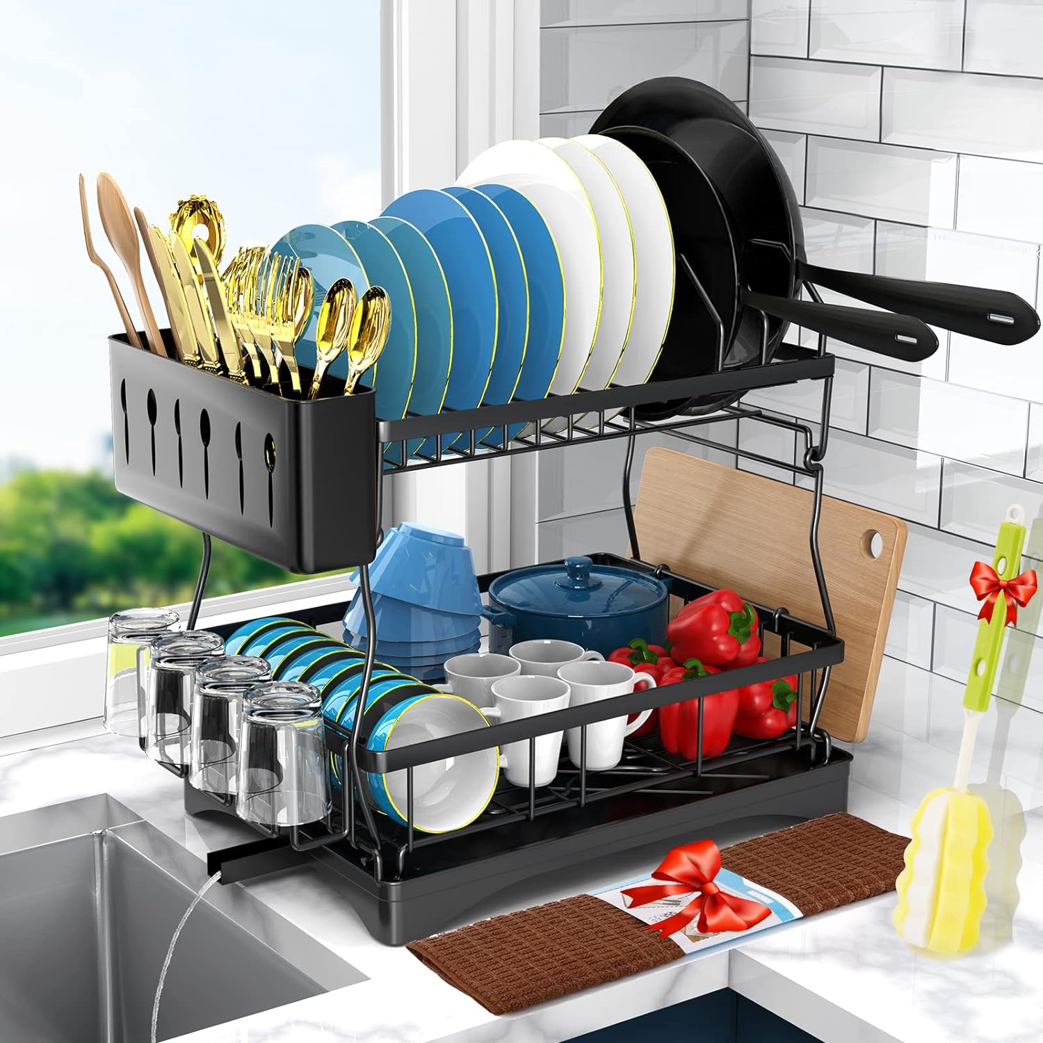 Estante multiusos: este colador de platos para encimera de cocina hace pleno uso del espacio de la encimera, y hay un espacio de 7.6 pulgadas entre las dos capas para un fácil acceso. El soporte para utensilios en el lateral tiene dos agujeros, y también es una buena opción para quitarlo e instalarlo en la pared.