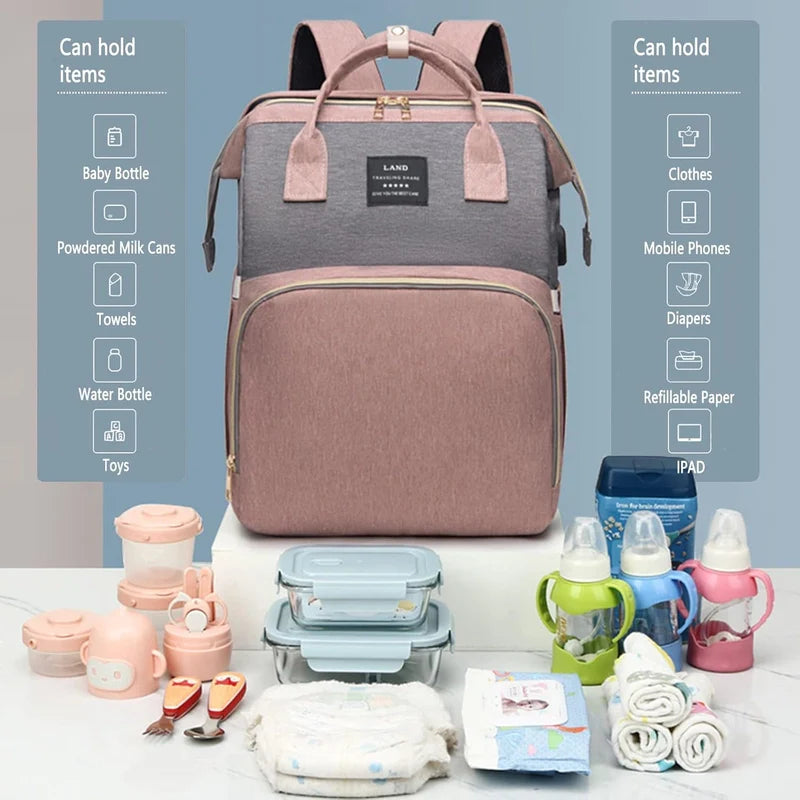 The ultimate travel diaper backpack: instant crib & charger built-in!